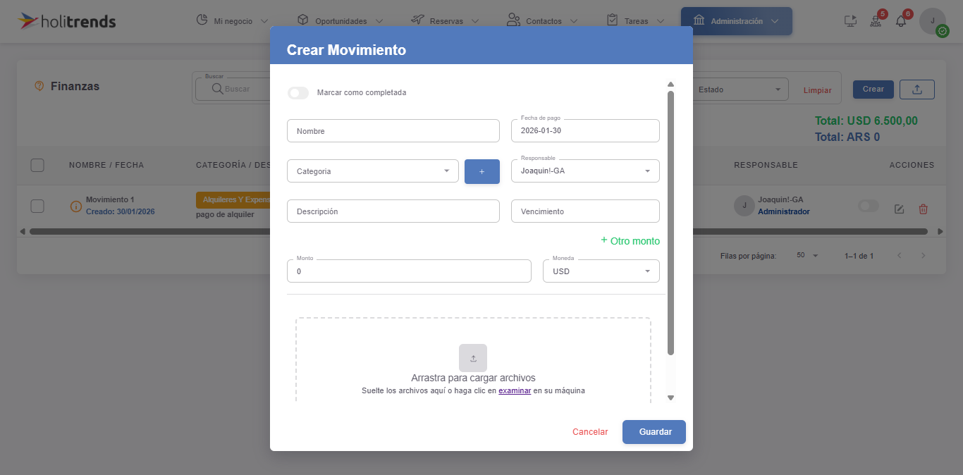 - Responsable: usuario asignado al movimiento.