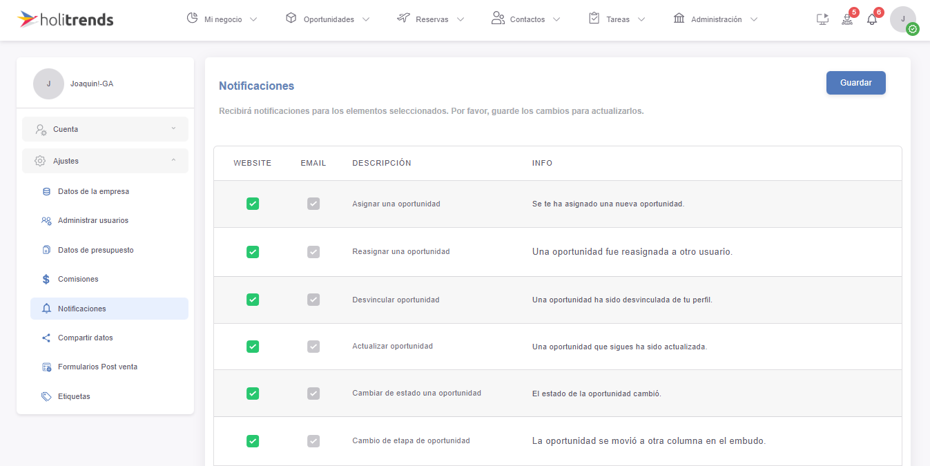 - Activar / desactivar notificaciones: permite habilitar o deshabilitar cada tipo de notificación para Website y Email.